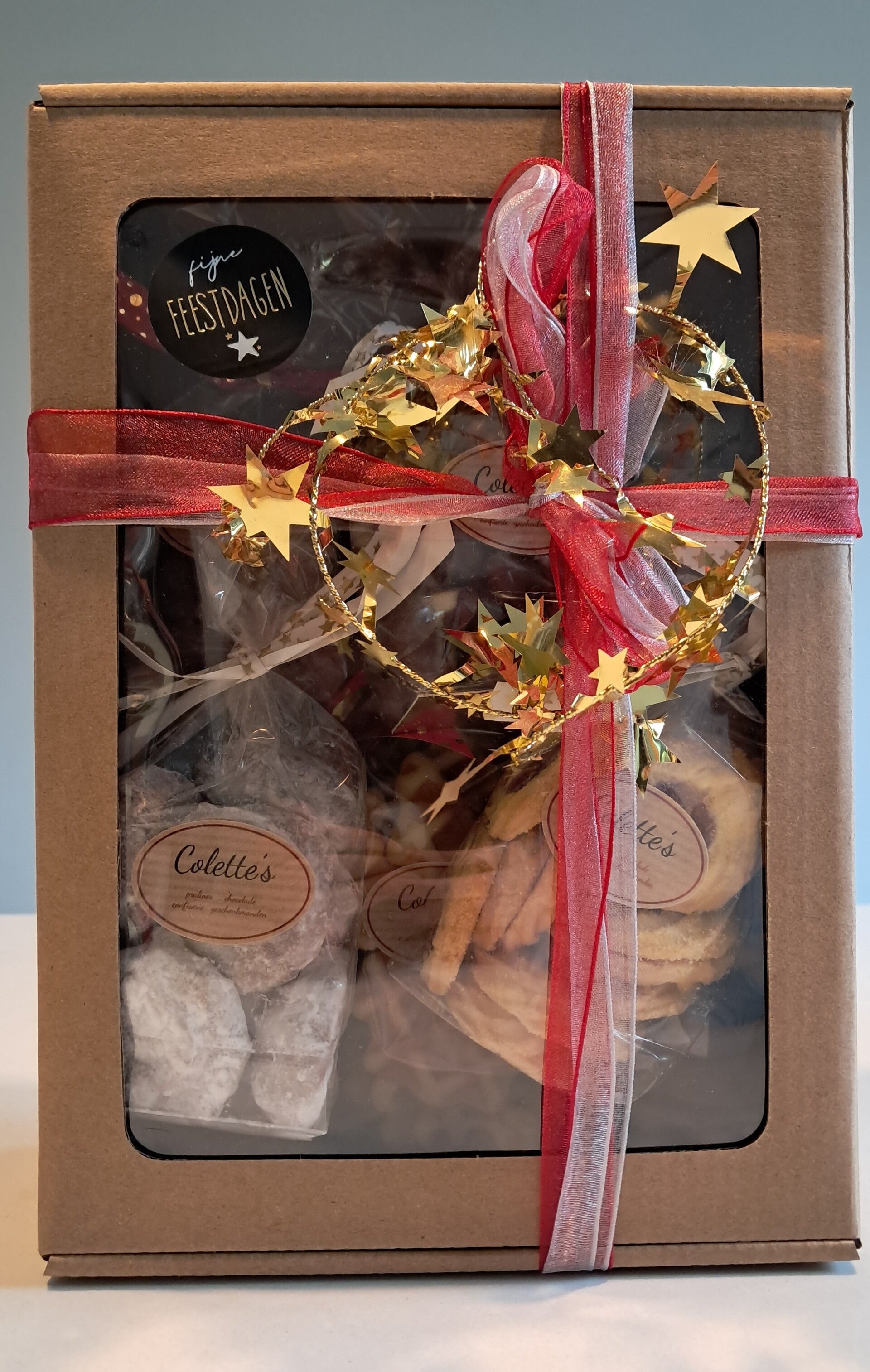 Vensterdoos gevuld met pâtes de fruit, boterwafeltjes, zeevruchten, boterkoekjes, truffels, macarons, sneeuwballen