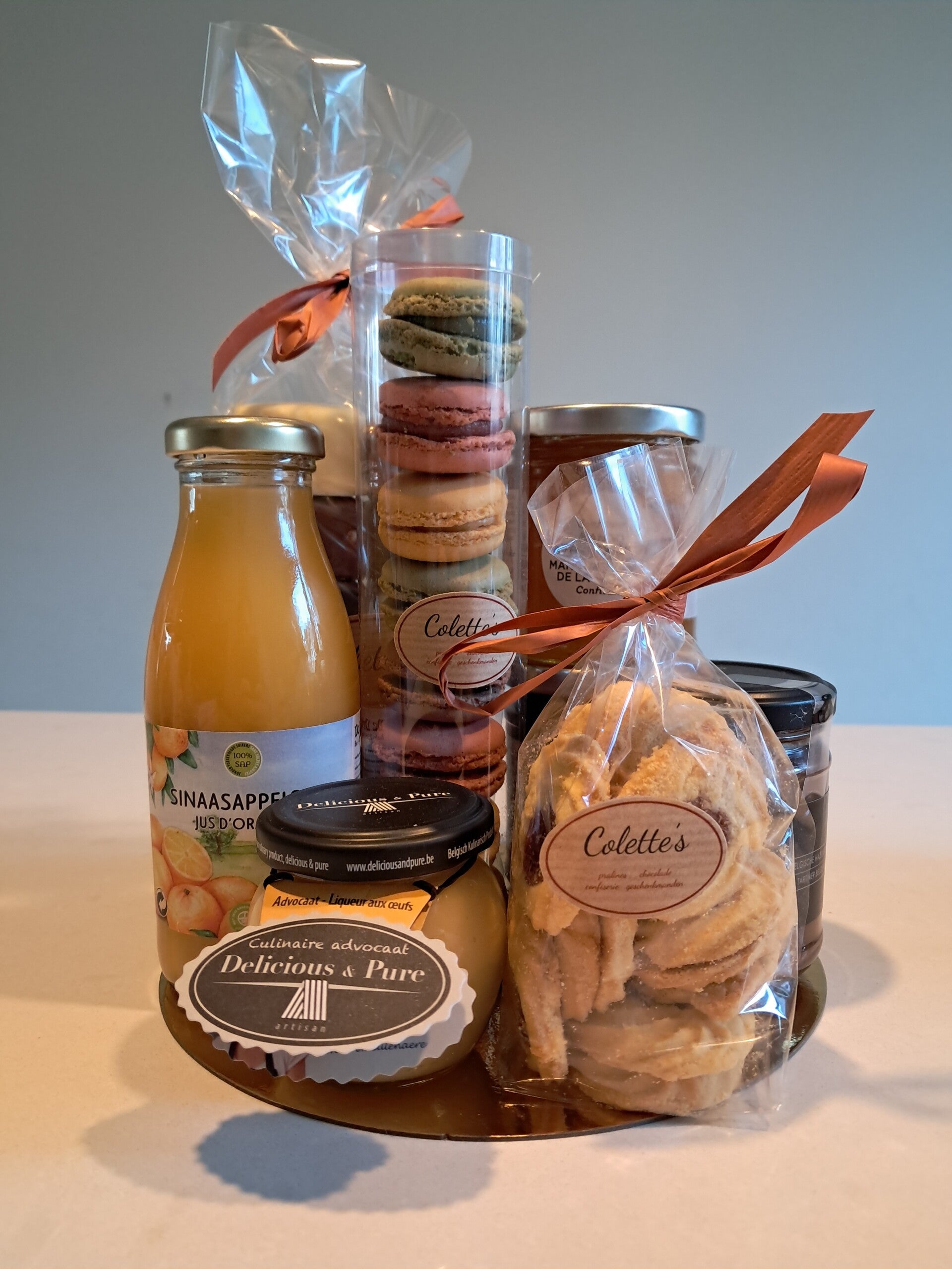Een geschenkbord gevuld met een selectie van Colette’s beste lekkernijen: macarons, boterkoekjes, chocolade spekken, ambachterlijke advocaat en heerlijke confituur. Aangevuld met fruitsap en feestelijk verpakt. Een verfijnd cadeau dat altijd in de smaak valt.
